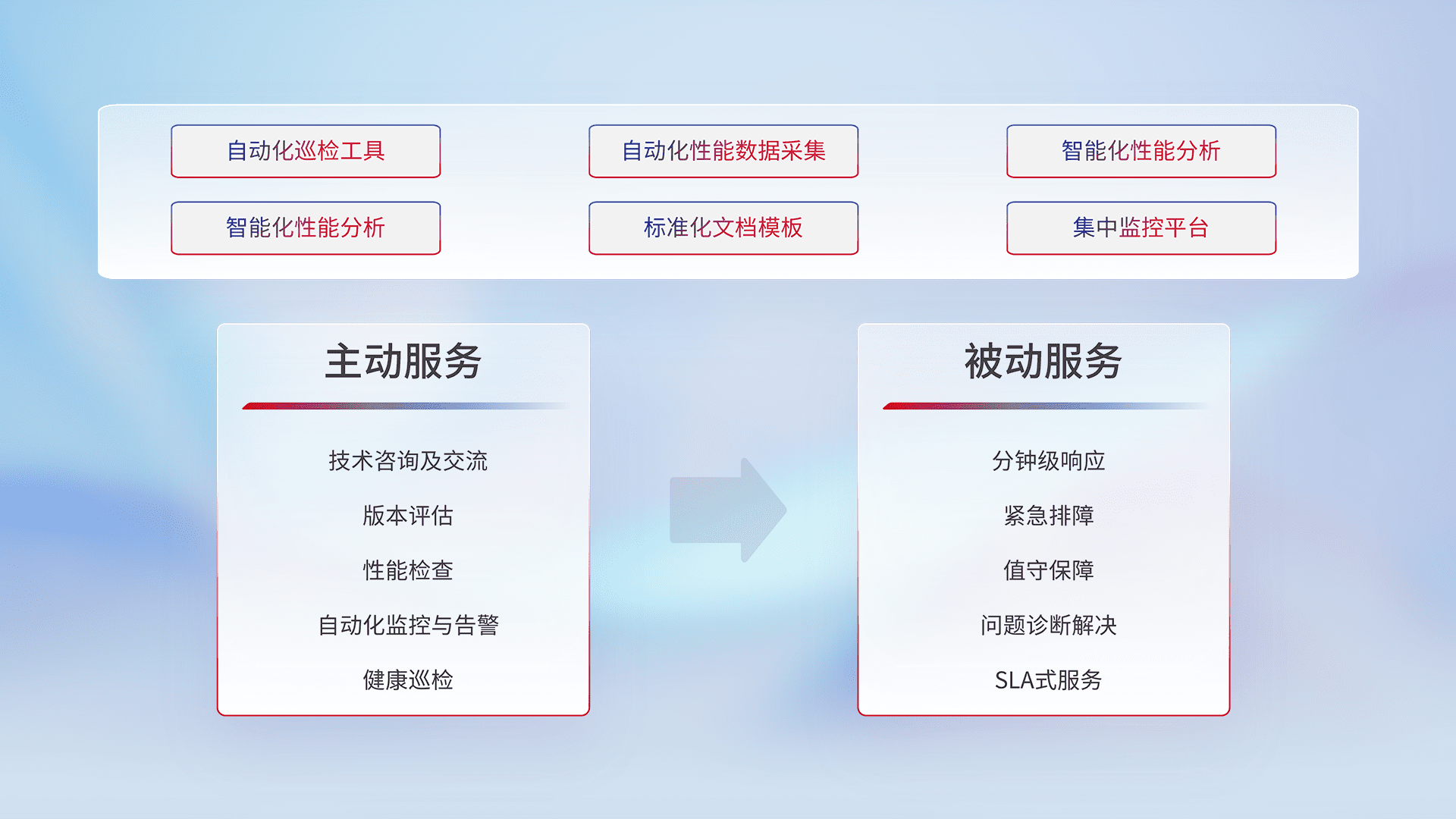 智能化工具和标准化文档,,,,保障服务质量,,,,提供主动服务(包含技术咨询、、版本评估、、、、性能检查、、、、自动化监控与告警、、健康巡检)和被动服务包含(分钟级响应、、、紧急排障、、、、值守保障、、、、问题诊断解决、、、SLA服务)。。。。